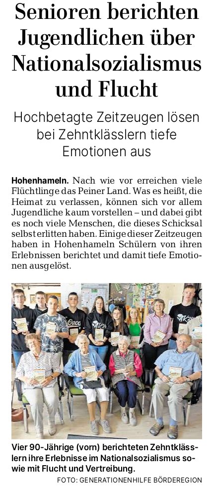 Die Peiner Allgemeine Zeitung berichtet von einer Veranstaltung der Generationenhilfe Börderegion e. V., in der über 90-jährige Vereinsmiglieder vor einer Gruppe jugendlicher Schüler aus ihrer Jugend berichten